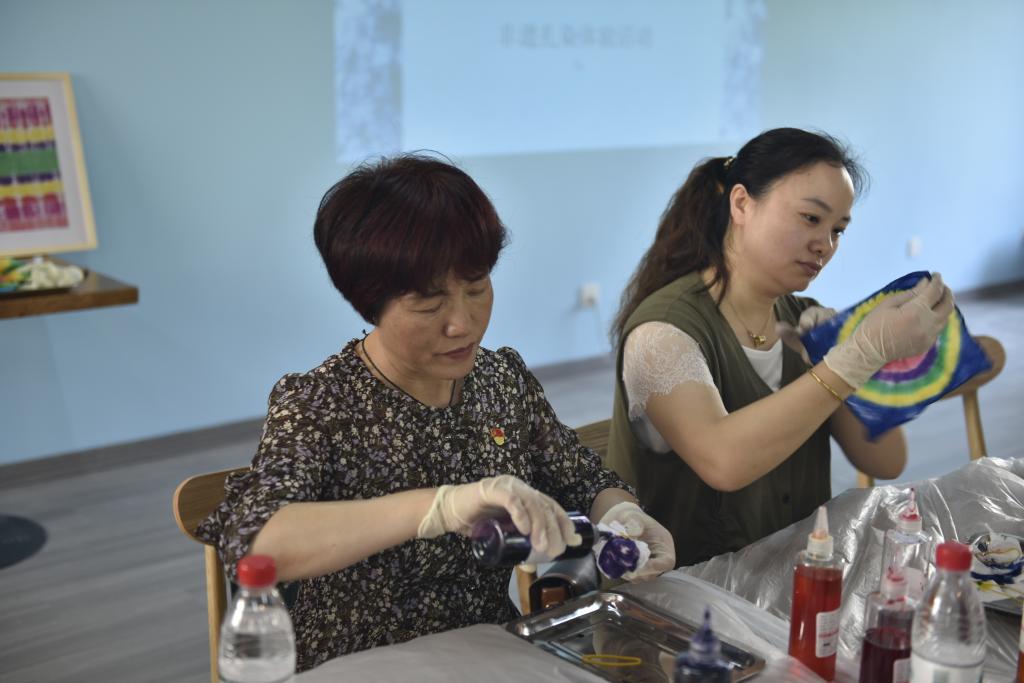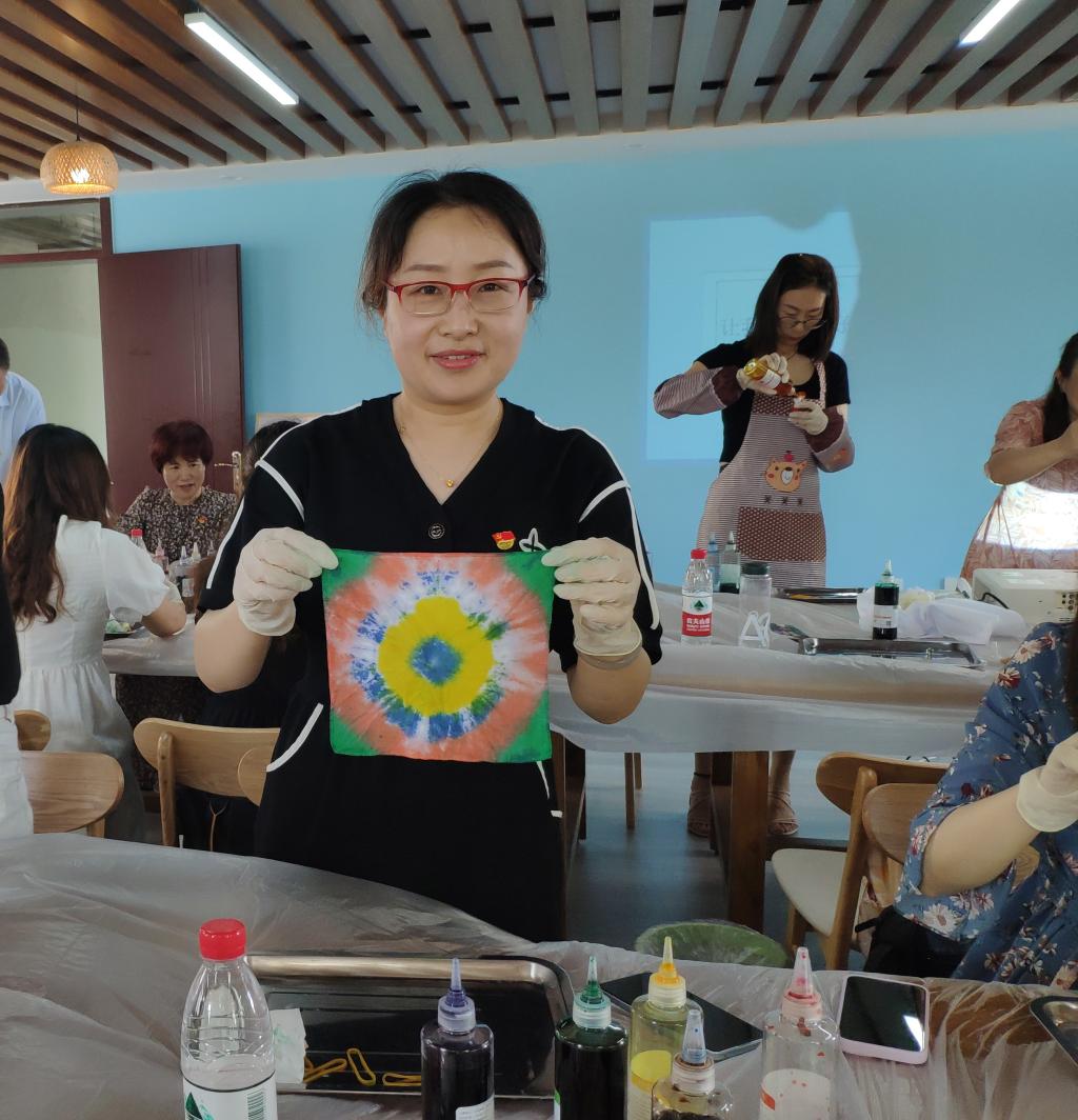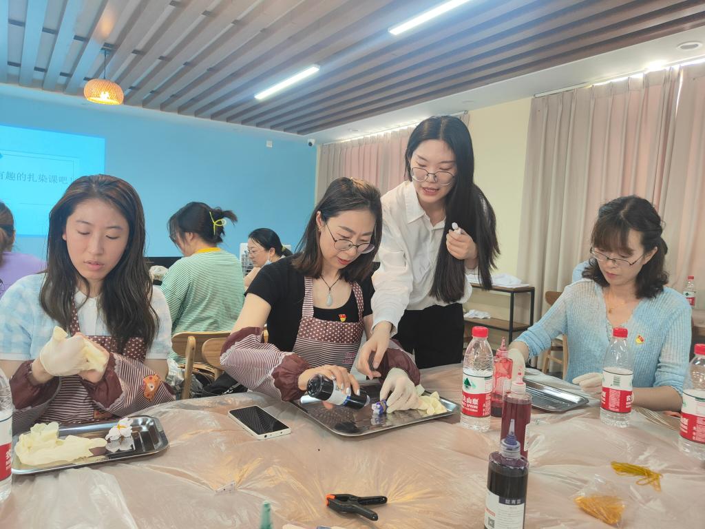 活动伊始,茅山校区六点半大美课堂讲师段玉洁老师认真地为党支部书记、党员代表讲解了扎染的发展历史、党和国家对于非遗的保护传承,详细地介绍了扎染的工艺起源、扎染样式、特点及制作技巧,并现场演示了扎染工艺的流程。大家跃跃欲试,都迫不及待地体验了起来。一方素布、一抹颜色,一道两道三道四道……捆呀捆,这部分用靛蓝色,接下来的部分用红色,好像黄色也不错……每个人的捆绑方式各异,染料浸染的时长不一,作品呈现出来的花色也各有千秋,都是独一无二的。参加此次党员教育活动的党员纷纷表示“扎染真的太有意义,太好看了,以后还要参加这样的党员教育活动”。